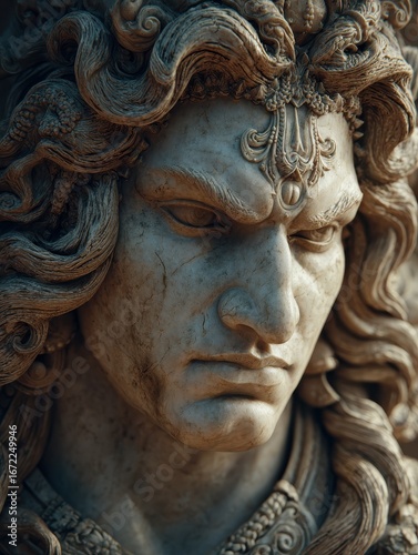 a marble bust of an indian deity with long curly hair and a focused expression the intricate details and serious demeanor embody strength protection and cultural heritage