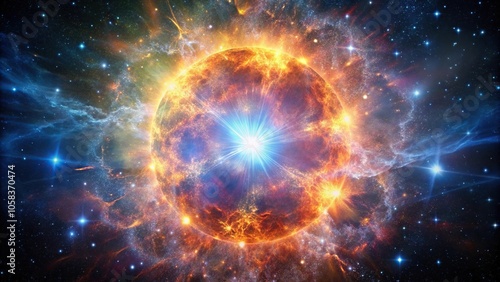 A massive star exploding in a supernova explosion, cosmic disaster, cosmic event, starburst, fiery blast