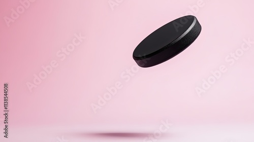 A matte black hockey puck floating on a pastel pink background for a bold and unexpected visual contrast.