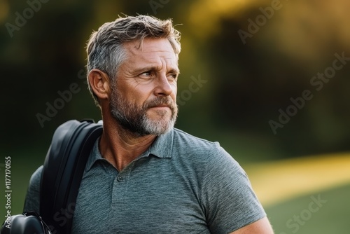 A mature man with a gray shirt portrays wisdom and contemplation as he stands in a lush environment, reflecting on life amidst the quiet beauty of nature.