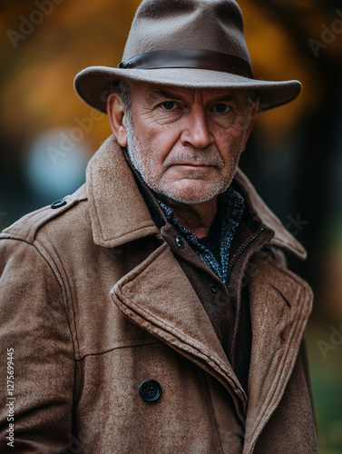 A mature man with a serious expression, wearing a brown coat and a fedora hat in a fall setting.