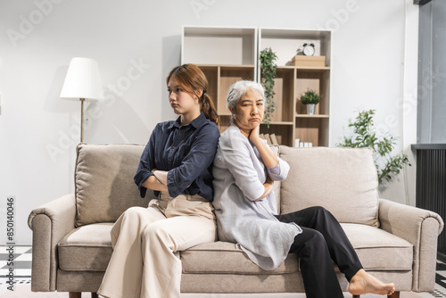 A mature mom and her young daughter, both Asian, sit on a sofa, engaged in a quarrel. Their argument escalates into a conflict, with clashes and friction over misunderstandings.