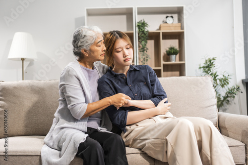 A mature mom and her young daughter, both Asian, sit on a sofa. The daughter appears sick and unwell, causing worry and possibly depression. The mom tries to encourage her and stay by her side.