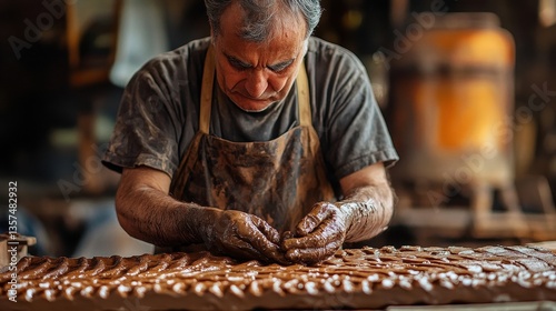 craftsman, pottery, clay, hand, working, art, artisan, creation, brown, texture, shaping, molding, detail, studio, workshop, table, process, old, wrinkle, apron, focusing, concentration, thoughtful, serious, artistic, creative, skilled, professional, dirty, earth, material, pattern, design, line, making, age, mature, ceramic, sculpt, close, up, person, inside, light, view
