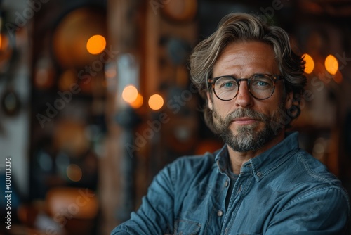 A mature, stylish man with glasses and a neatly groomed beard, in a warm indoor setting