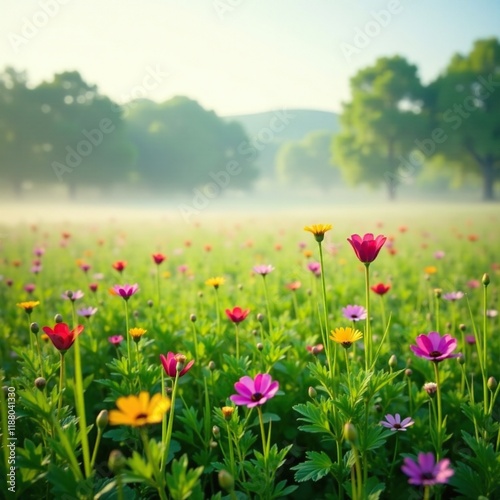 A meadow filled with tall grasses and colorful wildflowers in the misty morning, tall grass, morning
