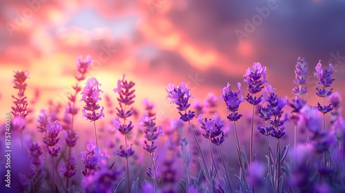 A meadow of bright purple lavender, their slender stems swaying gently in the wind under a sunset sky painted with pastel hues. The focus is on the delicate blooms of the flowers.