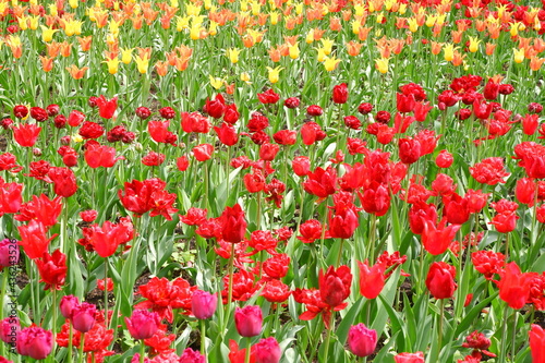 A meadow of tulips. Beautiful flowers in the garden. Suitable for backgrounds.