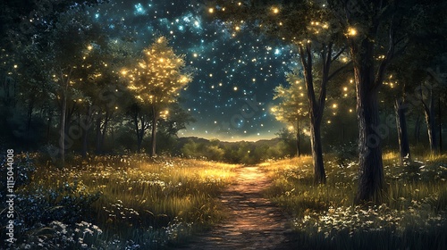 A meadow trail lit faintly by the stars leading through a cluster of trees