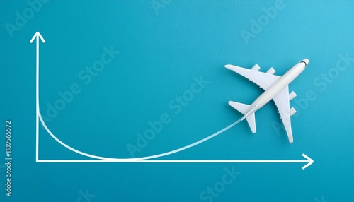 A meandering upward curved graph, with a small model of an airplane following the top of the upward curved graph model
