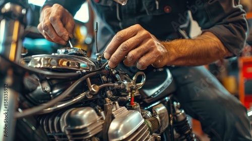 A mechanic conducting a comprehensive engine tune-up on a motorcycle, adjusting valves and carburetors to optimize performance and fuel efficiency