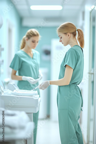 A medical professional in scrubs working in a hospital environment with advanced medical equipment, symbolizing healthcare, innovation, and medical expertise in a clinical setting.