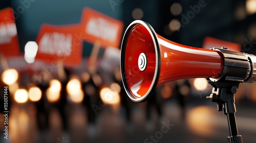 A megaphone stands prominently in the foreground, with a blurred group of protesters holding signs in the background, symbolizing activism and collective voice.
