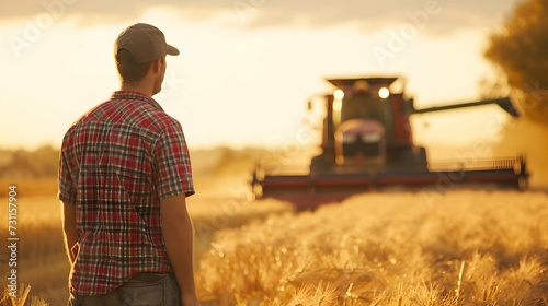 a men standing in a field with a tractor behind her in the background is a combine of grain being harvested
