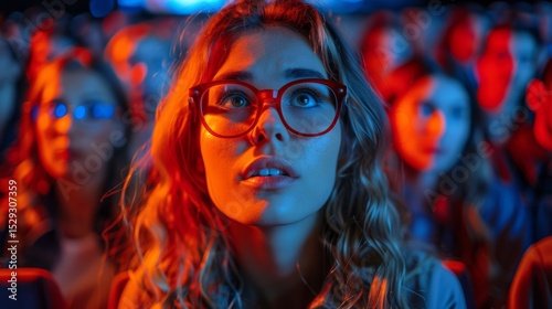 A mesmerized young woman with curly hair and glasses watches a performance in a vibrant setting, capturing the emotion of excitement and awe in a crowded atmosphere.
