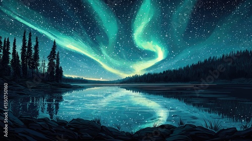mesmerizing, aethereal, night, scene, northern, light, vibrant, comic, style, setting, remote, wilderness, under, starry, where, aurora, borealis, dance, across, heaven, flowing, ribbon, green, turquoise, bold, sweeping, line, aglow, saturated, colours, below, calm, lake, mirror, up high, creating, stunning, that, depth, intrigue, rocky, shoreline