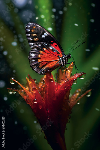 a mesmerizing close-up of a butterfly perched delicately on a dew-covered flower created with Generative Ai