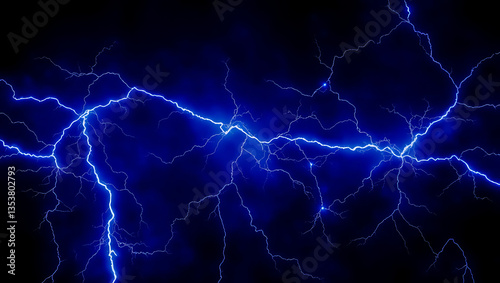 A mesmerizing electric lighting effect radiates against a dark, mysterious black background, evoking the intense energy of a stormy night, with bold, vibrant lightning bolts of electric blue and white