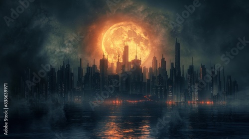A mesmerizing full moon rising above a silhouetted skyline, casting a mystical glow over the cityscape