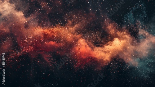 A mesmerizing image capturing the intense burst of red and gold dust against a dark backdrop, frozen in time with high-speed photography
