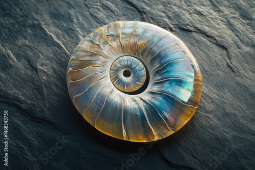 A mesmerizing iridescent ammonite fossil rests on a dark slate surface, showcasing its intricate spiral structure and vibrant colors.