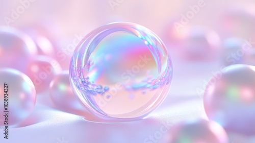 A mesmerizing iridescent bubble surrounded by soft pastel pearls, creating a dreamy, ethereal atmosphere.