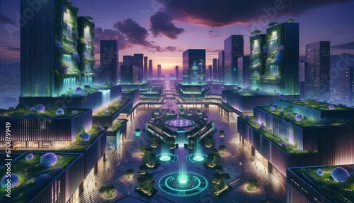 A mesmerizing metropolis illuminated by the neon glow of skyscrapers and the digital buzz of advanced technology, its skyline adorned with a magnificent fountain in the night sky futuristic dream