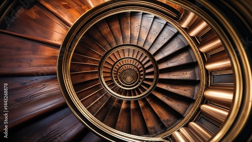 A mesmerizing spiral staircase, crafted from rich, dark wood and accented with elegant gold detailing. The intricate design creates a captivating visual experience.