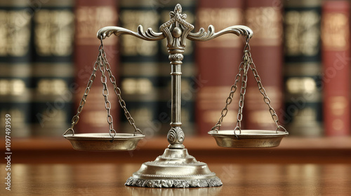 A metallic scale of justice stands on a wooden surface, with law books in the background, symbolizing fairness and legal proceedings.