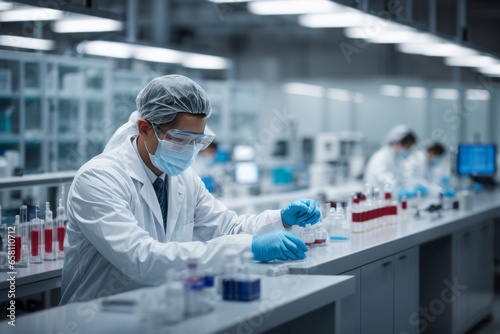 A microbiologist wearing sterile clothes and glasses conducts research in the laboratory. Evolution, science, pandemic, medicine, health, technology concepts
