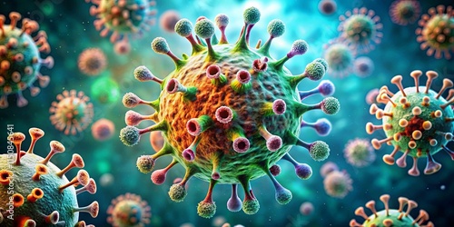 A microscopic world of vibrant, spiky spheres, each a miniature universe of intricate detail, teeming with the potential for both harm and resilience.