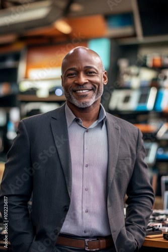 middle, aged, black, businessman, standing, proudly, front, electronic, store, tech, product, neatly, displayed, confident, smile, highlight, leadership, business, acumen