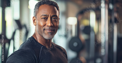A middle-aged black man with salt-and-pepper hair, dressed in workout gear, standing confidently in a gym setting, with fitness equipment visible in the background