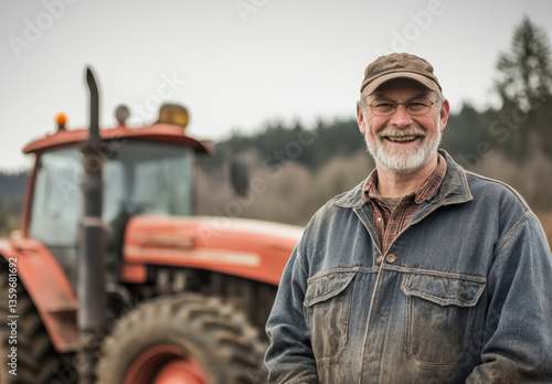 A middle-aged farmer stands confidently near his tractor in a field, showcasing his dedication to agriculture. The landscape features trees in the background, emphasizing the countryside setting