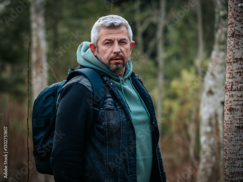 A middle-aged man stands in the woods with a backpack, a hoodie, and a denim jacket. His serious expression and outdoor attire suggest adventure, exploration, or deep thought.