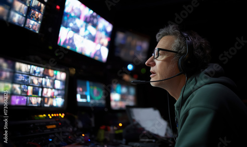 A middle-aged man with a headset microphone. He works at a control panel, surrounded by multiple glowing screens displaying various video feeds. Media production. Live broadcast technician.