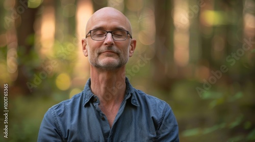 A middle-aged man with glasses meditates in a forest setting, his eyes closed and a calm expression on his face.