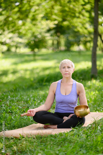 A middle-aged woman sits in a lotus position in a park, holds a Tibetan singing bowl in her hands and plays on it during a meditation session.The concept of relaxation, meditation