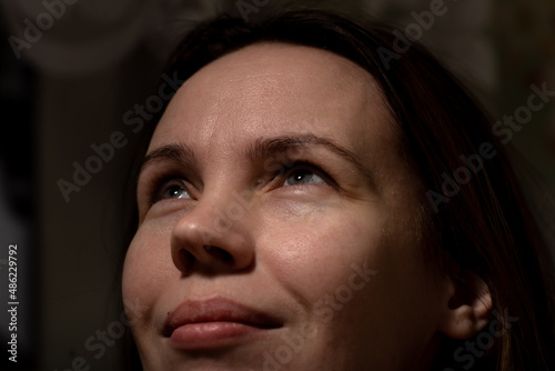 A middle-aged woman smiles. Attractive woman in her forties without make-up. Close-up.