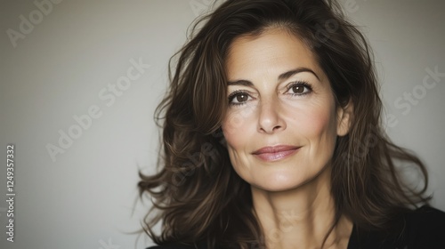 woman, smiling, portrait, middle-aged, brown hair, natural makeup, happy, cheerful, face, beauty, closeup, friendly, positive, relaxed, casual attire, elegant, confident, lifestyle, expression, joy, attractive, adult, happiness, female, person, people, studio, isolated, warm, soft, serene, calm, charming, graceful, lovely, skin, eye, hair, emotion, closeup, joyful, natural, head shot, light, neutral