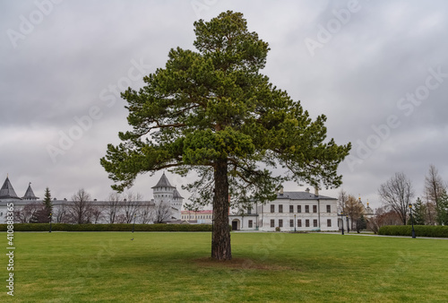 A mighty lonely pine tree on the territory of the Tobolsk (Russia) Kremlin, growing in a green meadow with soft grass on an autumn cloudy day. Historic site, memory of ancestors