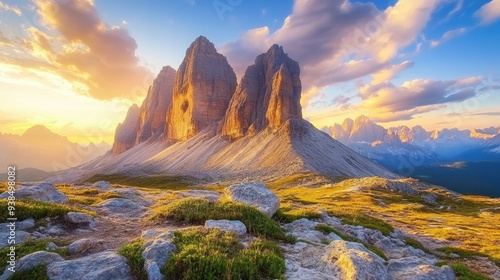 A mighty rocky massif Tre Cime di Lavaredo. Location place Italian Alps, Sexten Dolomiti, South Tyrol, Europe. Photo wallpaper. Popular tourist attraction. Discover the beauty of earth , ai
