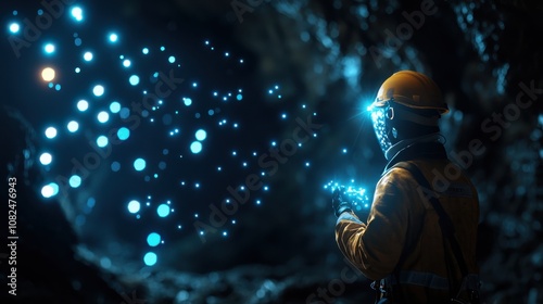 A miner wearing a helmet stands solemnly at the entrance of a dark mine tunnel, with blue lights providing a sharp contrast to the surrounding darkness