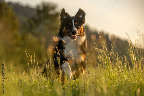 A Mini Aussie dog on a wildlfower meadow during sunset in summer outdoors