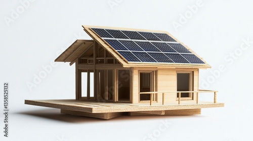 A miniature house design with solar panels on its roof, isolated on a white background, showcasing energy-saving and eco-friendly living solutions.