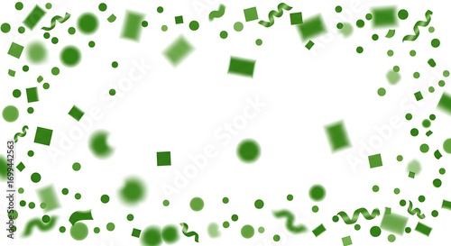 A minimal vector of green confetti pieces scattered randomly, centered on a clean white background