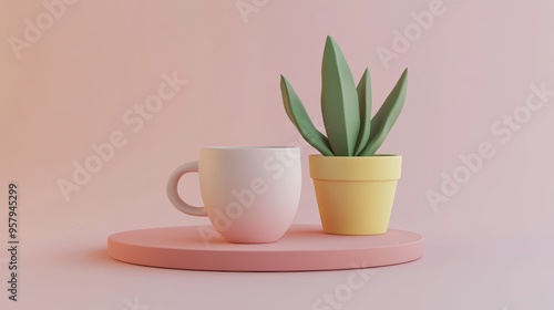 A minimalist arrangement featuring a white cup and a yellow planter with green leaves on a pastel pink background.
