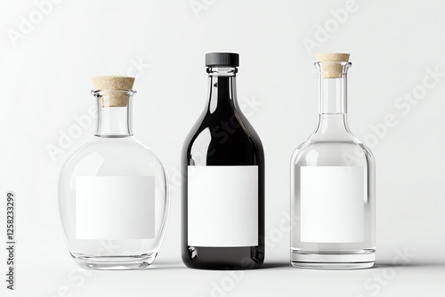 A minimalist arrangement of glass bottles with wooden corks, perfect for various beverages or drinks.