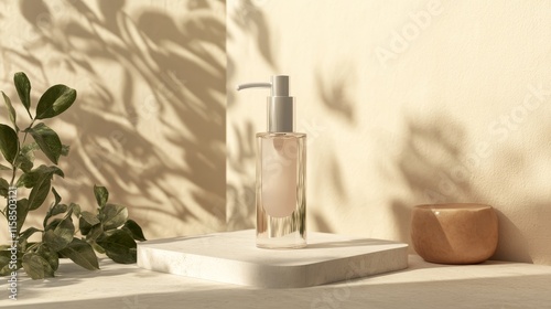 bottle, pump, liquid, glasses, container, skincare, cosmetic, natural, beauty, aesthetic, design, simplicity, elegance, light, shadow, decor, surface, marble, earthy, tone, organic, fresh, clean, wellness, home, style, botanical, relaxation, harmony, tranquil, minimalism, modern, chic, ambience, nature, environment, presentation, art, product, display, fragrance, essence, moisturise, luxury, pampering, ritual, health, lifestyle