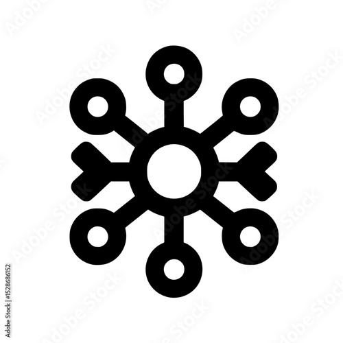 A minimalist black and white icon depicting a stylized snowflake or network structure.